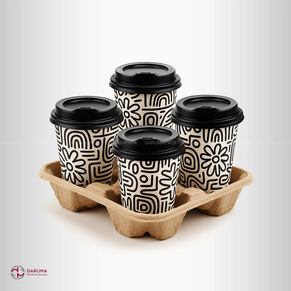 کاپ هولدر چهار تایی تخم‌مرغی، یک پایه لیوان بیرون‌بر با ساختار پایدار و طراحی ارگونومیک است که امکان حمل هم‌زمان چهار نوشیدنی را بدون ریختن، لیز خوردن یا تغییر زاویه فراهم می‌کند. این محصول از خمیر کاغذ بازیافتی (Molded Pulp) تولید می‌شود و مقاومت مناسبی در برابر فشار، ضربه، رطوبت سطحی و دمای نوشیدنی گرم دارد؛ به همین دلیل برای سرو قهوه، هات‌چاکلت، چای، لاته، نوشیدنی سرد، میلک‌ شیک، نوشابه و سایر لیوان‌های کاغذی یا پلیمری بسیار کاربردی است.